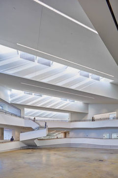The completed project is defined on the interior by its daylighting and by the extraordinary spatial expression and experience of collectivity. Instead of clerestories, as are typical in north facing sawtooth roofs of this kind, the vertical surfaces are solid and reflect southern light from a series of sloped linear skylights. The warm color temperature of the reflected light defines the character of the building in contrast to the cold color of the existing studio’s northern light. Formally, the roof system binds all of the new building’s spaces together and thus creates an unusual impression of continuity but without spatial homogeneity. The commons is composed of two pairs of ramps tied together, as if in a knot, by a spiral-like suspended stair. The solid parts of the ramp railings are kept low to enable viewing of the central space from afar. The movement generated by the sequence of stairs and ramps dramatizes the presence of people and experience of centrality. The building multiplies opportunities for informal gathering. The stairs are wide to accommodate pausing for conversation. Tiered spaces define relationships among groups of rooms that locally share the same level. The existing building’s studio has also been transformed, with offices directly accessible along the whole perimeter to allow for constant interaction between students and faculty and between disciplines. On the exterior, a new courtyard between the buildings is defined and activated. The lifting gesture makes the building less an object than a means to frame a sequence through the campus. New views through the building produce astonishing continuity between the existing raised courtyard and the floor of the commons. Thus, they are both experienced as part of a network of significant public outdoor and indoor rooms in the university.