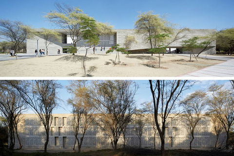 The building stands as a new educational typology created under four main concerns: A new learning landscape: The building offer spaces that can enrich learning, focused on enhancing quality of life as much as on supporting the learning experience. For achieving this, the building stimulates informal learning outside classical learning spaces. Learning can take place anywhere/anytime, blending mobile technology with social activity in the multiple non-designated open spaces it offers. Sense of community: The creation of non-designated spaces for students to work together outside the classrooms contributes to creating a sense of community, where the shared interests developed via networks is enriched through face to face interaction. Social and economic boundaries tend to blur when people learn to know each other in these nonhierarchical spaces. The building as a campus: Although clearly defined by a 70 x 70m quadrangular shape, the building is composed by 11 independent structures, 2 and 3 levels height, under ample cantilevered roofs that emerge from each one, providing shadow over multiple gathering and circulation places. It has a permeable ground floor that favors shortcuts across the building when walking through the campus. Space and Climate: By creating a comfort zone in the permanently sunny, hot and dry climate of the Peruvian northern desert, the shaded open-air spaces nurture the academic life the same way the dry forest allows living in the desert.