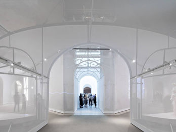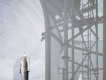 We inserted a white, translucent volume into the existing brick and stone corridors of the Lehman Wing, softening its hard geometries. Echoing the sectional relationship of a central clerestory and perimeter naves, the resulting ghost cathedral resonates with the language of the adjacent Medieval Art gallery. A raised platform built across the double height atrium provides a continuous circulation and an additional 2,300 square foot central gallery – an unprecedented intervention in the Lehman Wing. Upon arrival, this domed clerestory orients visitor’s with Karl Lagerfeld’s Chanel wedding dress that embodies the exhibition’s theme. Details of the 20-foot train’s baroque pattern are projected on the dome’s scrim, recalling the Sistine Chapel. Four chapel-style poches provide areas to focus on case studies of different techniques. The high-performance, perforated membrane of the ghost cathedral offers the tensile flexibility required for the dome geometries as well as varying degrees of transparency. When lit from the front, the scrim appears opaque enough to function as a projection backdrop for garment details. Lit from behind, the scrim appears transparent, exposing a sense of the Lehman Wing’s existing material palette and language. The unexpected spatial depth of the scrim allows for visual connections to the wedding dress from all quadrants of the Lehman Wing, while also revealing silhouettes of the temporary scaffolding framework housed within. As an integrated system for lighting, signage and projection, the scrim seamlessly serves multiple curation needs that would otherwise rely on overpowering media screens.