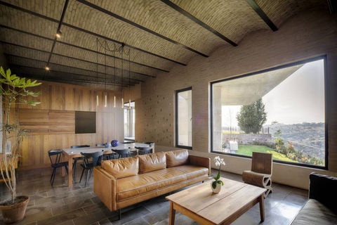 Appearing monolithic and isolated from the street, Casa Campanario opens up to the ravine at the rear of the house. Its density and texture construct the spatial experience of the procession that connects interior to landscape. Rammed-earth blocks are fabricated on-site and are the house’s primary source of material exploration. The blocks are modular and can be configured to introduce lattices, openings for light, texture, and acoustic ceilings; they are also easily carved to take on a more dynamic form. The thermal and acoustic qualities of this type of construction add to the comfort of the house.